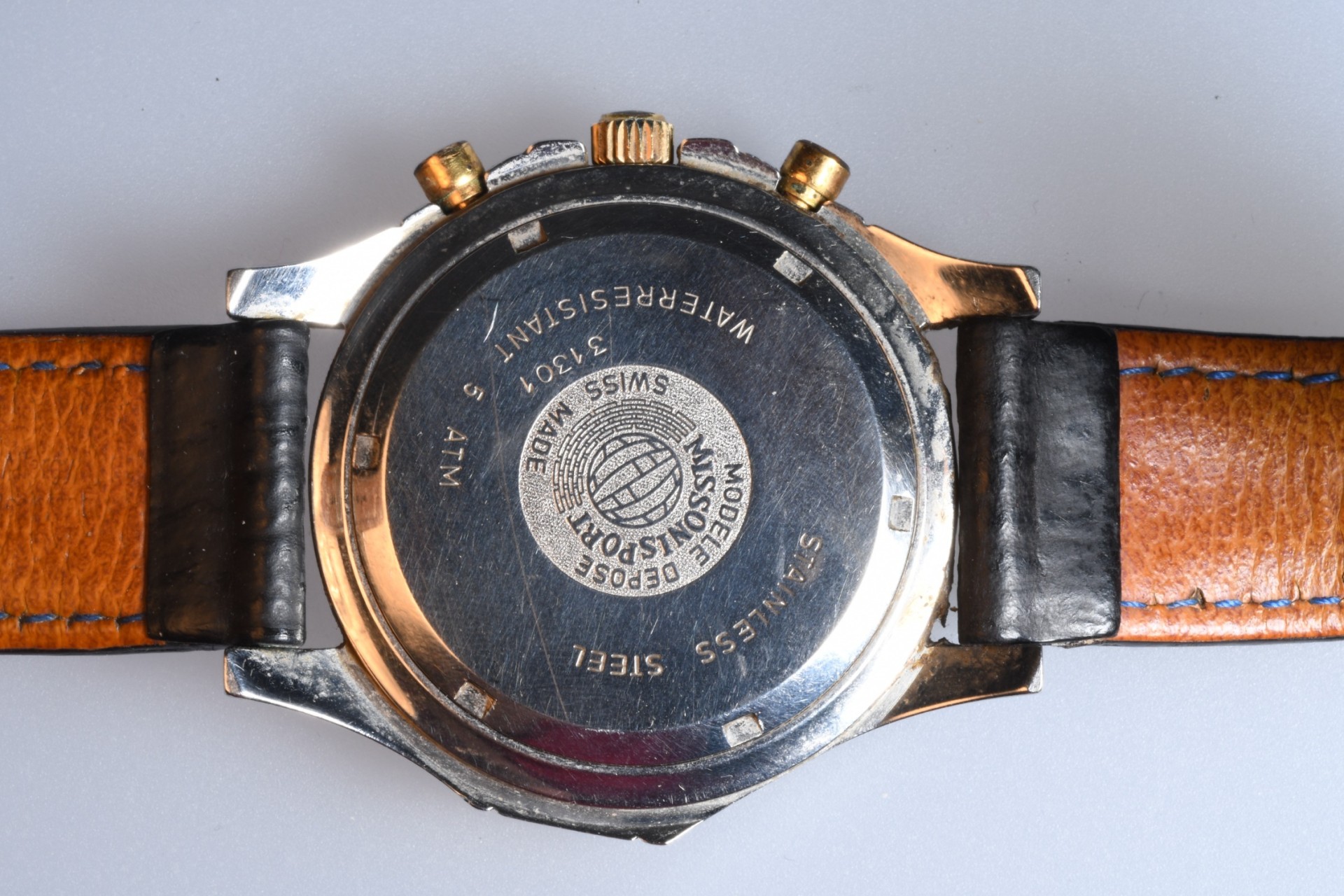 Chronograph, Stahlgehäuse mit vergoldeter Lünette, schwarzes Zifferblatt mit goldfarbener Markierung und Zeigern, Quarzuhrwerk, schwarzes Lederarmband. Stärkere Tragespuren. Funktion nicht geprüft.