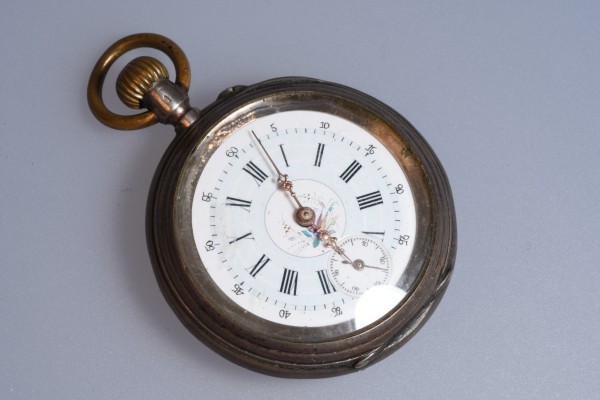 Deckel Si 800, Gehäuse versi., Ziffernblatt mit röm. Minuterie, himmelblauem Zierband und floraler Staffage. Sekunde bei der 6, DM ca. 6 cm. Werk läuft an, überholungsbedürftig.